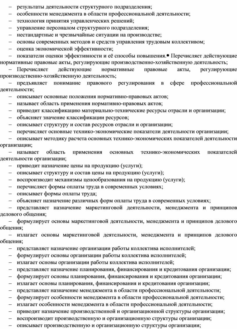 - Перечисляет действующие нормативные правовые акты, регулирующие производственно-хозяйственную деятельность; - предъявляет понимание правового регулирования в сфере профессиональной деятельности; - описывает основные положения нормативно-правовых актов; - называет область применения нормативно-правовых актов; - приводит классификацию материально-технические ресурсы отрасли и организации; - объясняет значение классификации ресурсов; - описывает структуру и состав ресурсов отрасли и организации; - перечисляет основные технико-экономические показатели деятельности организации; - описывает методику расчета основных технико-экономических показателей деятельности организации; - называет область применения основных технико-экономических показателей деятельности организации; - приводит назначение цены на продукцию (услуги); - описывает структуру и состав цены на продукцию (услуги); - воспроизводит механизмы ценообразования на продукцию (услуги); - перечисляет формы оплаты труда в современных условиях; - описывает формы оплаты труда; - объясняет назначение различных форм оплаты труда в современных условиях; - представляет назначение маркетинговой деятельности, менеджмента и принципов делового общения; - формулирует основы маркетинговой деятельности, менеджмента и принципов делового общения; - излагает основы маркетинговой деятельности, менеджмента и принципов делового общения; - представляет назначение организации работы коллектива исполнителей; - формулирует основы организации работы коллектива исполнителей; - излагает основы организации работы коллектива исполнителей; - представляет назначение планирования, финансирования и кредитования организации; - формулирует основы планирования, финансирования и кредитования организации; - излагает основы планирования, финансирования и кредитования организации; - представляет назначение менеджмента в области профессиональной деятельности; - формулирует особенности менеджмента в области профессиональной деятельности; - излагает особенности менеджмента в области профессиональной деятельности; - приводит назначение производственной и организационной структуры организации; - воспроизводит производственную и организационную структуры организации; - описывает производственную и организационную структуры организации; - объясняет назначение основных положений Конституции РФ, действующих нормативных правовых актов, регулирующих правоотношения в процессе профессиональной (трудовой) деятельности; - описывает классификацию, основные виды и правила составления нормативных правовых актов; - объясняет назначение классификации, основных видов и правил составления нормативных правовых актов; - формулирует основные правила составления нормативных правовых актов; - перечисляет основные задачи охраны труда; - перечисляет основные НПА об охране труда; - перечисляет основные нормы производственной санитарии; - излагает права и обязанности работников в сфере профессиональной деятельности; - объясняет назначение прав и обязанностей работников в сфере профессиональной деятельности; - называет область применения прав и обязанностей работников в сфере профессиональной деятельности. |
