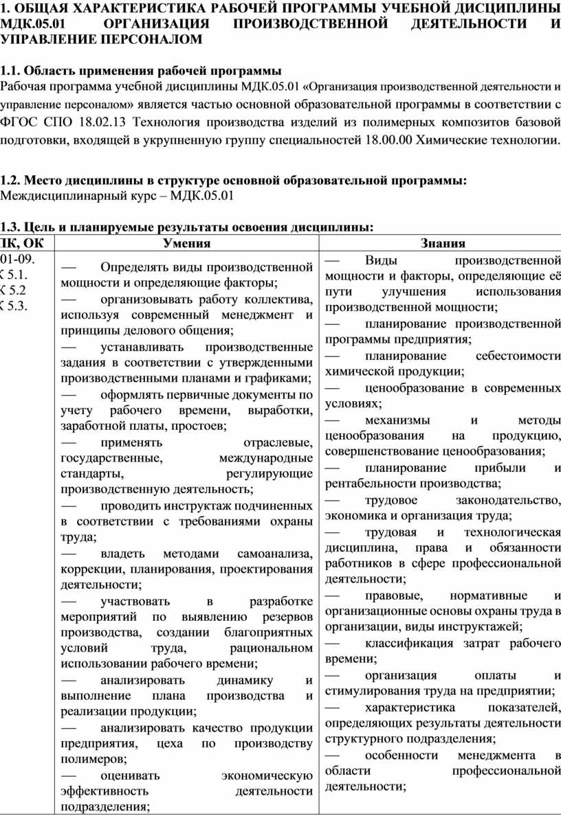 1. ОБЩАЯ ХАРАКТЕРИСТИКА РАБОЧЕЙ ПРОГРАММЫ УЧЕБНОЙ ДИСЦИПЛИНЫ МДК.05.01 ОРГАНИЗАЦИЯ ПРОИЗВОДСТВЕННОЙ ДЕЯТЕЛЬНОСТИ И УПРАВЛЕНИЕ ПЕРСОНАЛОМ
