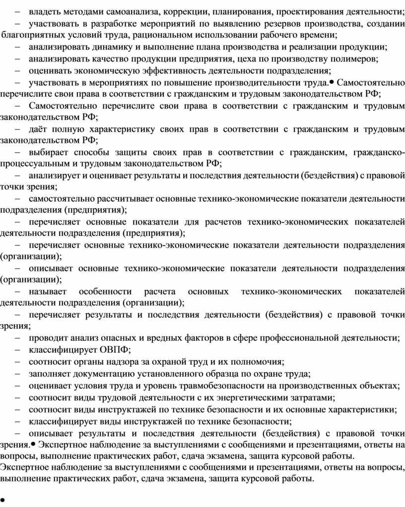 - Самостоятельно перечислите свои права в соответствии с гражданским и трудовым законодательством РФ; - даёт полную характеристику своих прав в соответствии с гражданским и трудовым законодательством РФ; - выбирает способы защиты своих прав в соответствии с гражданским, гражданско-процессуальным и трудовым законодательством РФ; - анализирует и оценивает результаты и последствия деятельности (бездействия) с правовой точки зрения; - самостоятельно рассчитывает основные технико-экономические показатели деятельности подразделения (предприятия); - перечисляет основные показатели для расчетов технико-экономических показателей деятельности подразделения (предприятия); - перечисляет основные технико-экономические показатели деятельности подразделения (организации); - описывает основные технико-экономические показатели деятельности подразделения (организации); - называет особенности расчета основных технико-экономических показателей деятельности подразделения (организации); - перечисляет результаты и последствия деятельности (бездействия) с правовой точки зрения; - проводит анализ опасных и вредных факторов в сфере профессиональной деятельности; - классифицирует ОВПФ; - соотносит органы надзора за охраной труд и их полномочия; - заполняет документацию установленного образца по охране труда; - оценивает условия труда и уровень травмобезопасности на производственных объектах; - соотносит виды трудовой деятельности с их энергетическими затратами; - соотносит виды инструктажей по технике безопасности и их основные характеристики; - классифицирует виды инструктажей по технике безопасности; - описывает результаты и последствия деятельности (бездействия) с правовой точки зрения. |