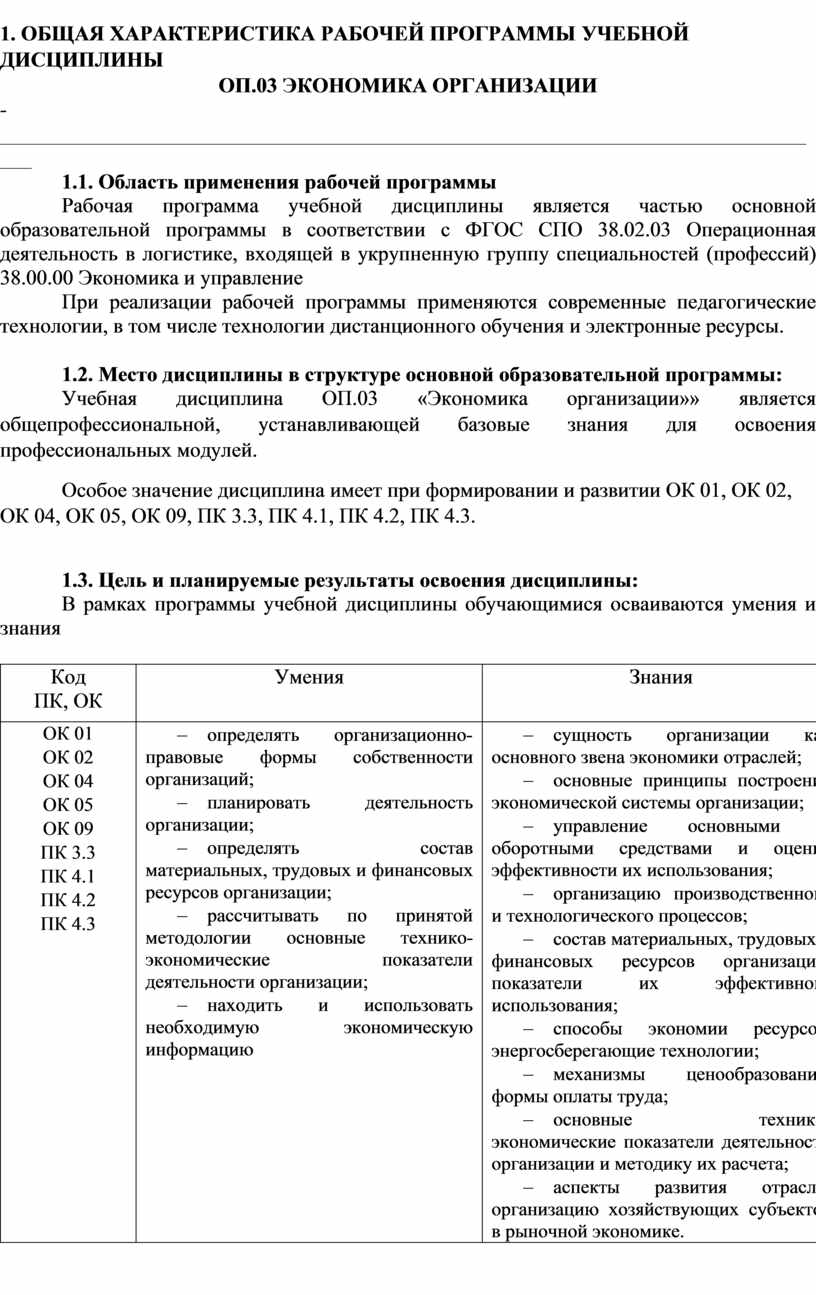 Учебная дисциплина ОП.03 «Экономика организации»» является общепрофессиональной, устанавливающей базовые знания для освоения профессиональных модулей.