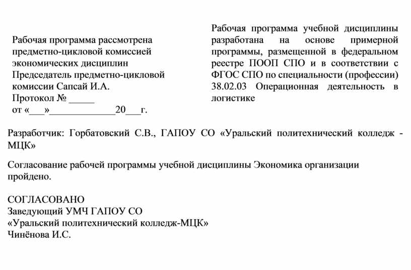 Рабочая программа рассмотрена предметно-цикловой комиссией экономических дисциплин Председатель предметно-цикловой комиссии Сапсай И.А. Протокол № _____ от «___»_____________20___г. |