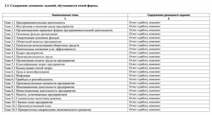 2.3. Содержание домашних заданий, обучающихся очной формы.