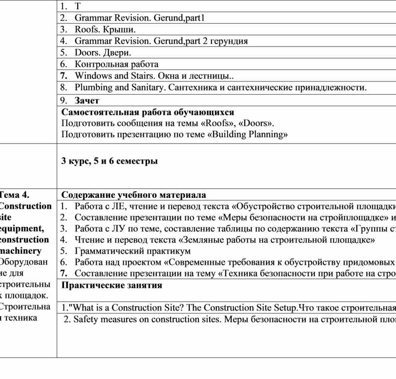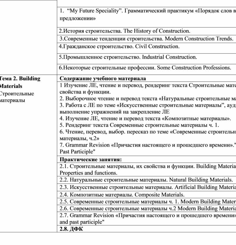 1. Изучение и работа с ЛЕ по теме “My Future Speciality” ». Выборочное чтение и пересказ текста 2. Ответы на вопросы, выполнение квизов по теме «История строительства» Аудирование, перевод на догадку. 3. Работа с ЛЕ, чтение и перевод текста, составление развёрнутого плана по теме «Современные тенденции строительства», «Промышленное строительство», «Некоторые строительные профессии», 4. Грамматический практикум «Порядок слов в английском предложении» |