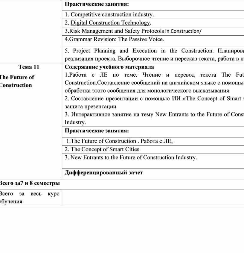 Содержание учебного материала 1.Работа с ЛЕ по теме. Чтение и перевод текста The Future of Construction.Составление сообщений на английском языке с помощью ИИ и обработка этого сообщения для монологического высказывания 2. Составление презентации с помощью ИИ «The Concept of Smart Cities», защита презентации 3. Интерактивное занятие на тему New Entrants to the Future of Construction Industry. |