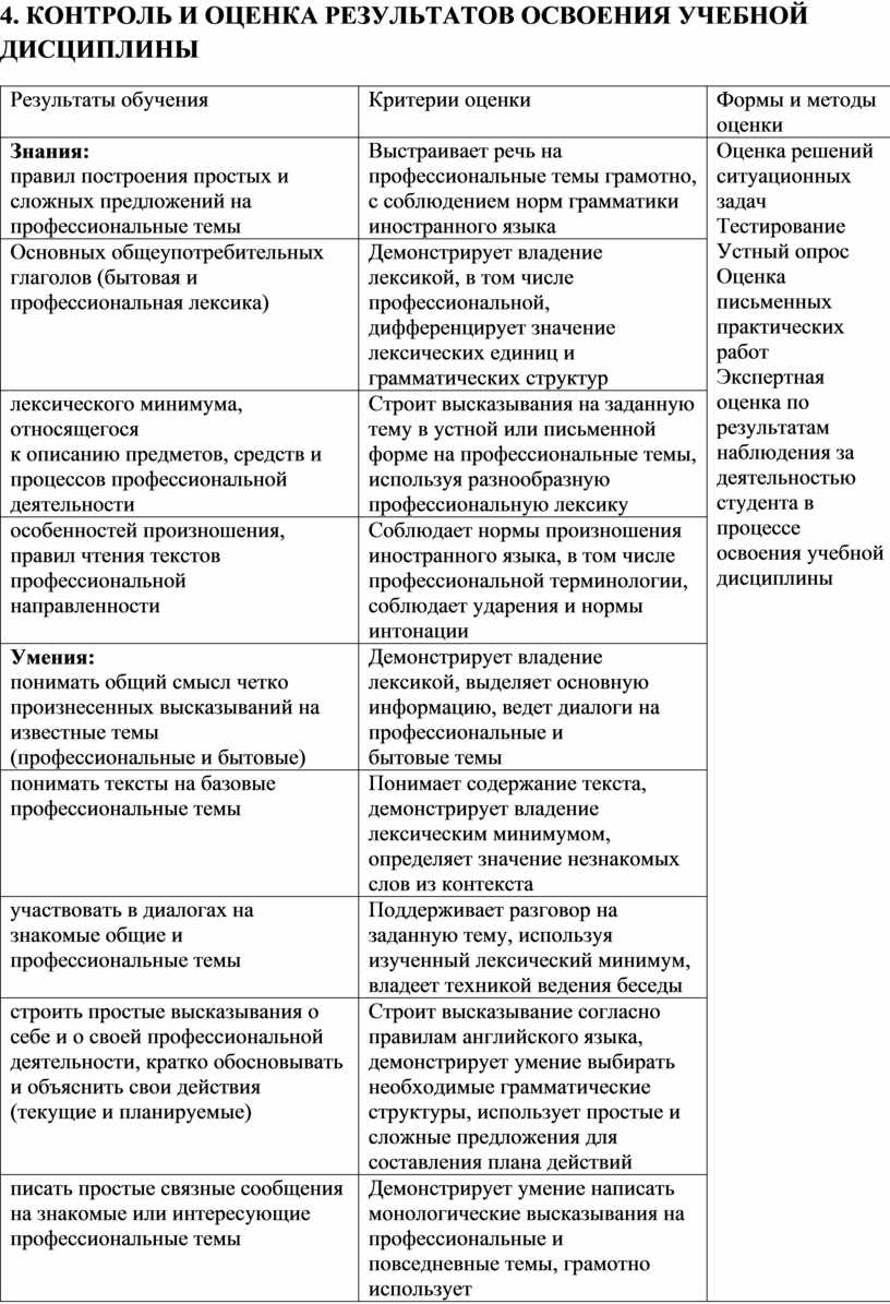 4. КОНТРОЛЬ И ОЦЕНКА РЕЗУЛЬТАТОВ ОСВОЕНИЯ УЧЕБНОЙ ДИСЦИПЛИНЫ