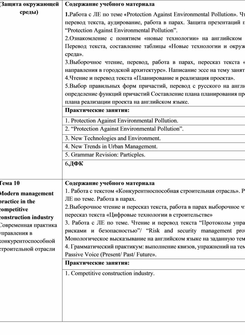 Содержание учебного материала 1.Работа с ЛЕ по теме «Protection Against Environmental Pollution». Чтение и перевод текста, аудирование, работа в парах. Защита презентаций по теме “Protection Against Environmental Pollution”. 2.Ознакомление с понятием «новые технологии» на английском языке,. Перевод текста, составление таблицы «Новые технологии и окружающая среда». 3.Выборочное чтение, перевод, работа в парах, пересказ текста «Новые направления в городской архитектуре». Написание эссе на тему занятия 4.Чтение и перевод текста «Планирование и реализация проекта». 5.Выбор правильных форм причастий, перевод с русского на английский, определение функций причастий Составление плана планирования проекта и плана реализации проекта на английском языке. |