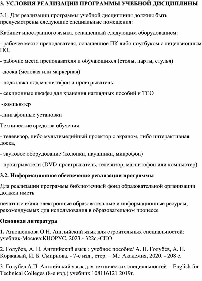 6. Голубев, А.П. Английский язык для строительных специальностей : учебник / Голубев А.П., Балюк Н.В., Смирнова И.Б. — Москва : КноРус, 2021. — 492 с. — ISBN 978-5-406-05603-5. — URL: https://book.ru/book/. — Текст : электронный.