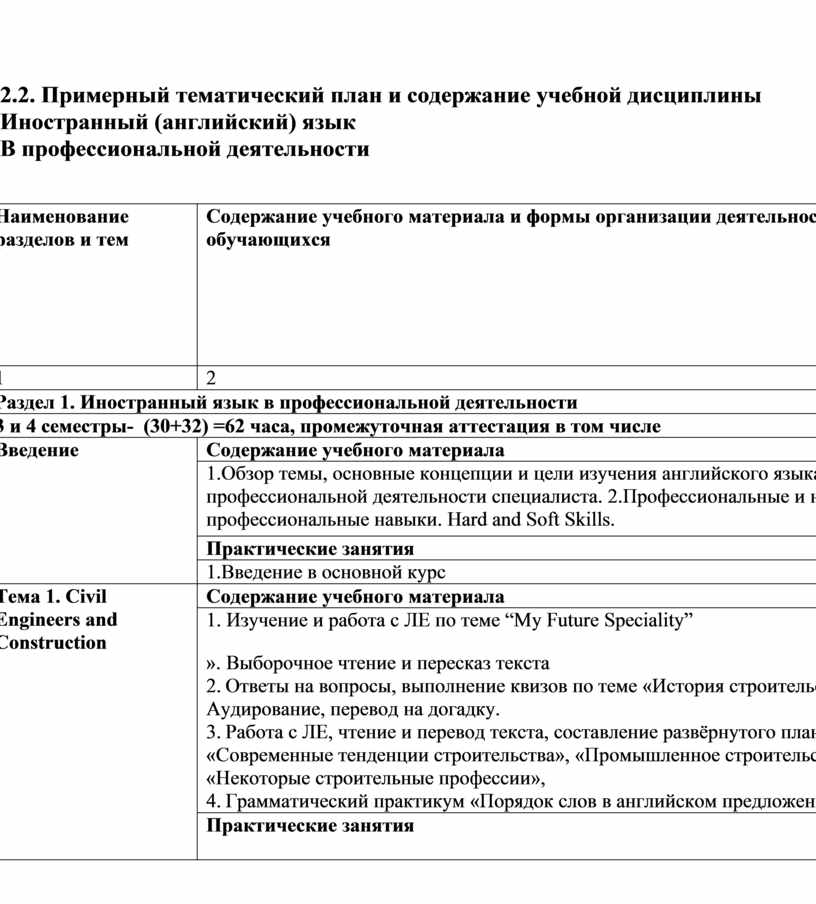 2.2. Примерный тематический план и содержание учебной дисциплины Иностранный (английский) язык
