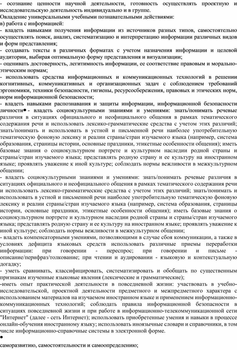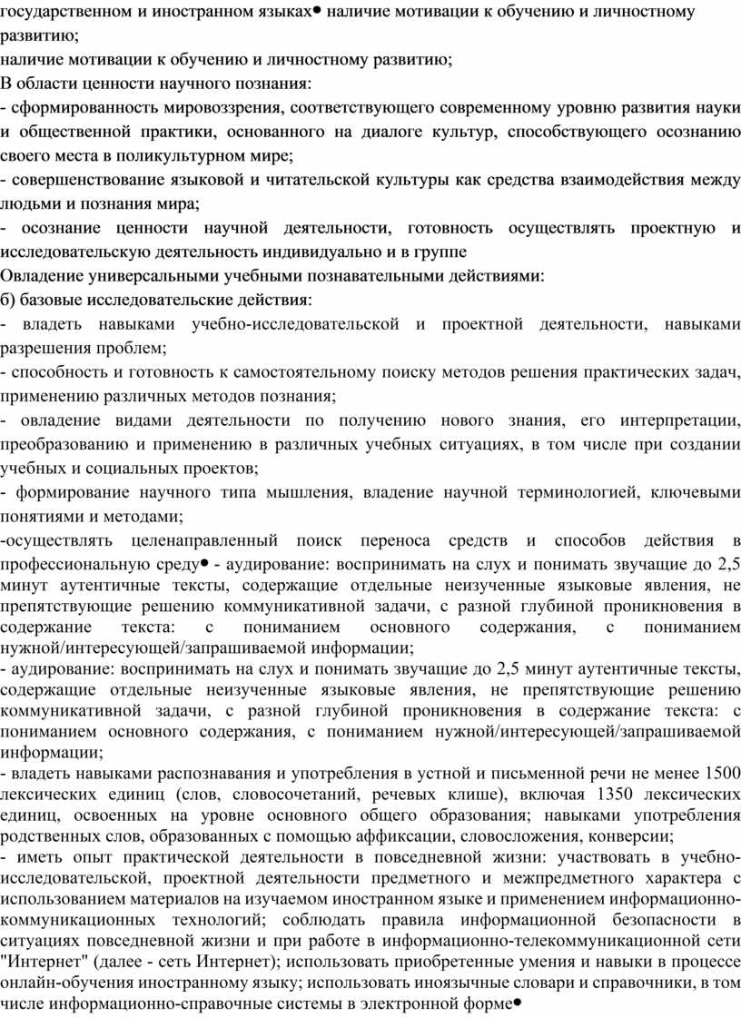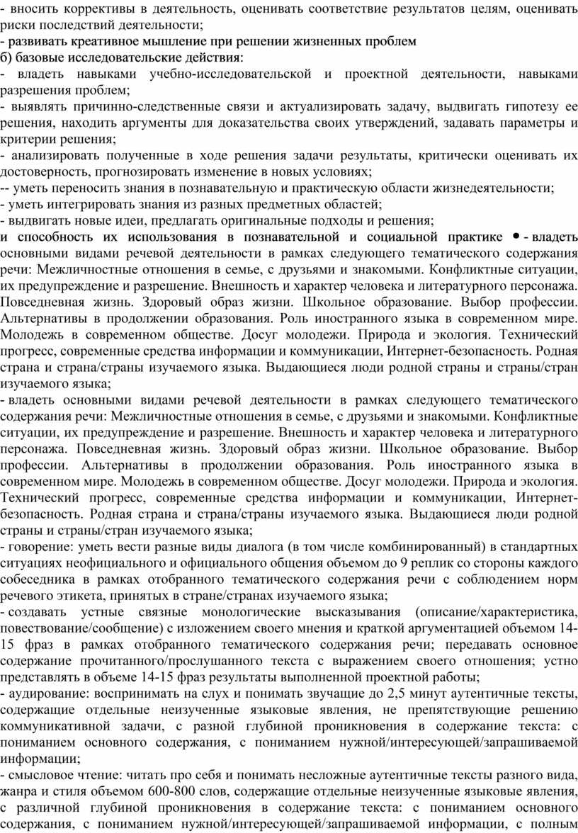 - аудирование: воспринимать на слух и понимать звучащие до 2,5 минут аутентичные тексты, содержащие отдельные неизученные языковые явления, не препятствующие решению коммуникативной задачи, с разной глубиной проникновения в содержание текста: с пониманием основного содержания, с пониманием нужной/интересующей/запрашиваемой информации; - владеть навыками распознавания и употребления в устной и письменной речи не менее 1500 лексических единиц (слов, словосочетаний, речевых клише), включая 1350 лексических единиц, освоенных на уровне основного общего образования; навыками употребления родственных слов, образованных с помощью аффиксации, словосложения, конверсии; - иметь опыт практической деятельности в повседневной жизни: участвовать в учебно-исследовательской, проектной деятельности предметного и межпредметного характера с использованием материалов на изучаемом иностранном языке и применением информационно-коммуникационных технологий; соблюдать правила информационной безопасности в ситуациях повседневной жизни и при работе в информационно-телекоммуникационной сети "Интернет" (далее - сеть Интернет); использовать приобретенные умения и навыки в процессе онлайн-обучения иностранному языку; использовать иноязычные словари и справочники, в том числе информационно-справочные системы в электронной форме |