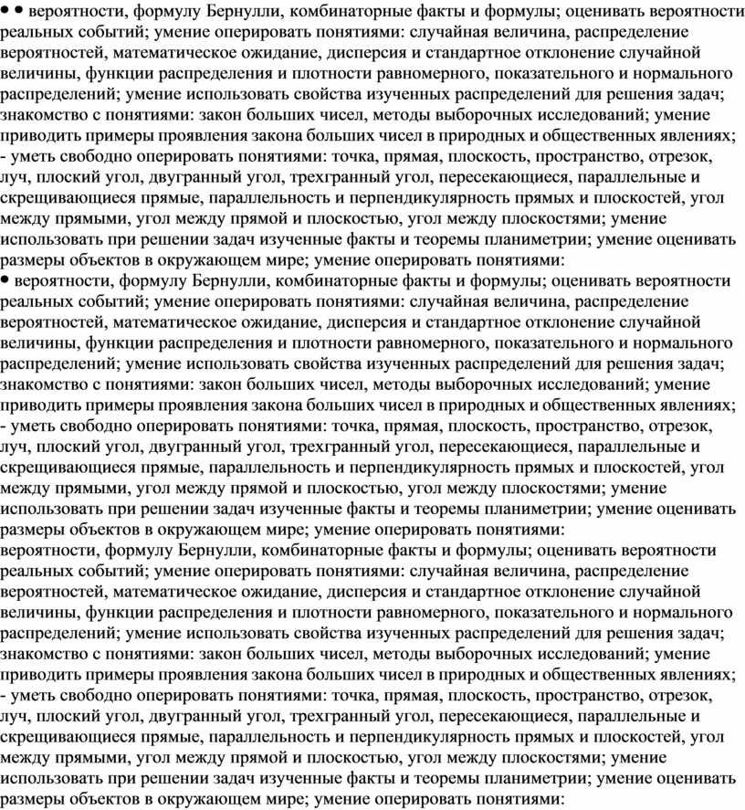 вероятности, формулу Бернулли, комбинаторные факты и формулы; оценивать вероятности реальных событий; умение оперировать понятиями: случайная величина, распределение вероятностей, математическое ожидание, дисперсия и стандартное отклонение случайной величины, функции распределения и плотности равномерного, показательного и нормального распределений; умение использовать свойства изученных распределений для решения задач; знакомство с понятиями: закон больших чисел, методы выборочных исследований; умение приводить примеры проявления закона больших чисел в природных и общественных явлениях; - уметь свободно оперировать понятиями: точка, прямая, плоскость, пространство, отрезок, луч, плоский угол, двугранный угол, трехгранный угол, пересекающиеся, параллельные и скрещивающиеся прямые, параллельность и перпендикулярность прямых и плоскостей, угол между прямыми, угол между прямой и плоскостью, угол между плоскостями; умение использовать при решении задач изученные факты и теоремы планиметрии; умение оценивать размеры объектов в окружающем мире; умение оперировать понятиями: многогранник, сечение многогранника, правильный многогранник, призма, |