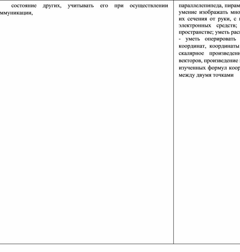 параллелепипеда, пирамиды, призмы, цилиндра, конуса, шара; умение изображать многогранники и поверхности вращения, их сечения от руки, с помощью чертежных инструментов и электронных средств; уметь распознавать симметрию в пространстве; уметь распознавать правильные многогранники; - уметь оперировать понятиями: прямоугольная система координат, координаты точки, вектор, координаты вектора, скалярное произведение, угол между векторами, сумма векторов, произведение вектора на число; находить с помощью изученных формул координаты середины отрезка, расстояние между двумя точками |