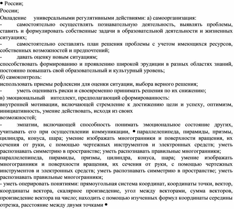 России; Овладение универсальными регулятивными действиями: а) самоорганизация: - самостоятельно осуществлять познавательную деятельность, выявлять проблемы, ставить и формулировать собственные задачи в образовательной деятельности и жизненных ситуациях; - самостоятельно составлять план решения проблемы с учетом имеющихся ресурсов, собственных возможностей и предпочтений; - давать оценку новым ситуациям; способствовать формированию и проявлению широкой эрудиции в разных областях знаний, постоянно повышать свой образовательный и культурный уровень; б) самоконтроль: использовать приемы рефлексии для оценки ситуации, выбора верного решения; - уметь оценивать риски и своевременно принимать решения по их снижению; в) эмоциональный интеллект, предполагающий сформированность: внутренней мотивации, включающей стремление к достижению цели и успеху, оптимизм, инициативность, умение действовать, исходя из своих возможностей; - эмпатии, включающей способность понимать эмоциональное состояние других, учитывать его при осуществлении коммуникации, |