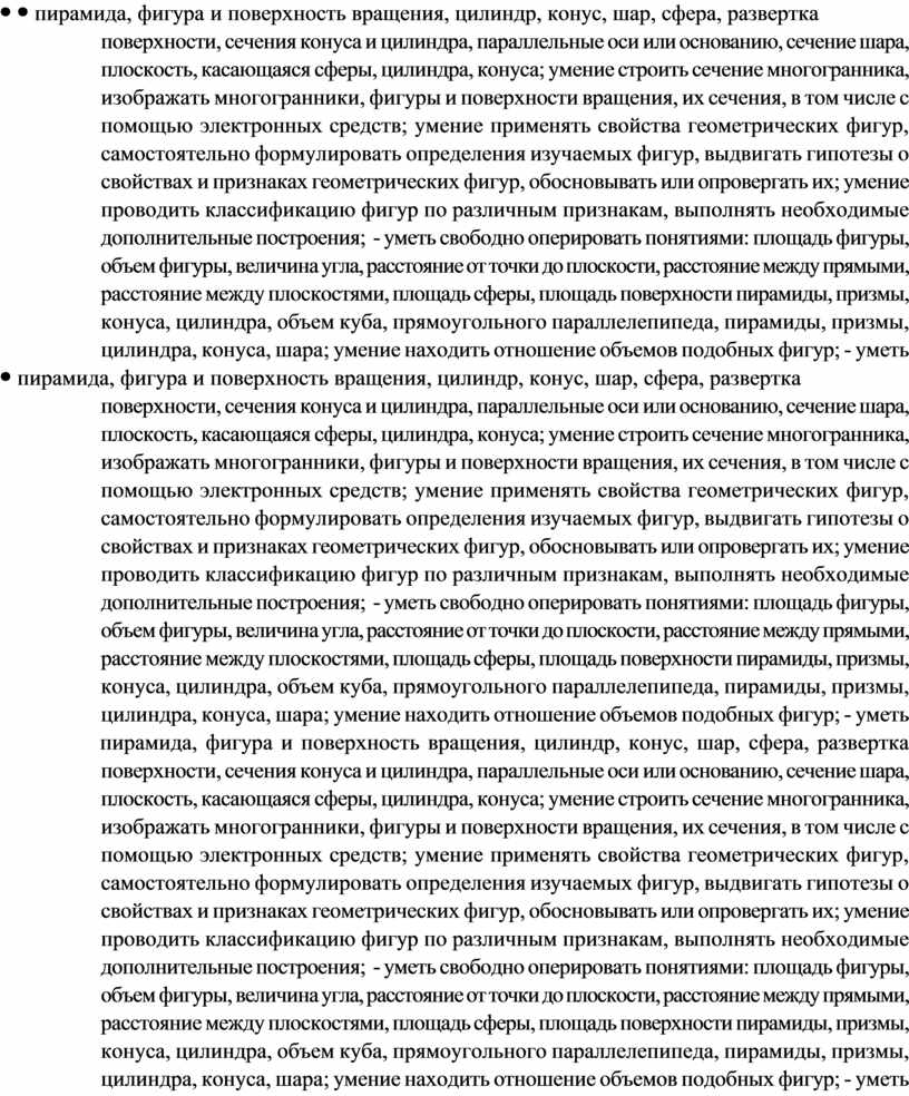 пирамида, фигура и поверхность вращения, цилиндр, конус, шар, сфера, развертка поверхности, сечения конуса и цилиндра, параллельные оси или основанию, сечение шара, плоскость, касающаяся сферы, цилиндра, конуса; умение строить сечение многогранника, изображать многогранники, фигуры и поверхности вращения, их сечения, в том числе с помощью электронных средств; умение применять свойства геометрических фигур, самостоятельно формулировать определения изучаемых фигур, выдвигать гипотезы о свойствах и признаках геометрических фигур, обосновывать или опровергать их; умение проводить классификацию фигур по различным признакам, выполнять необходимые дополнительные построения; - уметь свободно оперировать понятиями: площадь фигуры, объем фигуры, величина угла, расстояние от точки до плоскости, расстояние между прямыми, расстояние между плоскостями, площадь сферы, площадь поверхности пирамиды, призмы, конуса, цилиндра, объем куба, прямоугольного параллелепипеда, пирамиды, призмы, цилиндра, конуса, шара; умение находить отношение объемов подобных фигур; - уметь свободно оперировать понятиями: движение, параллельный перенос, симметрия на плоскости и в |