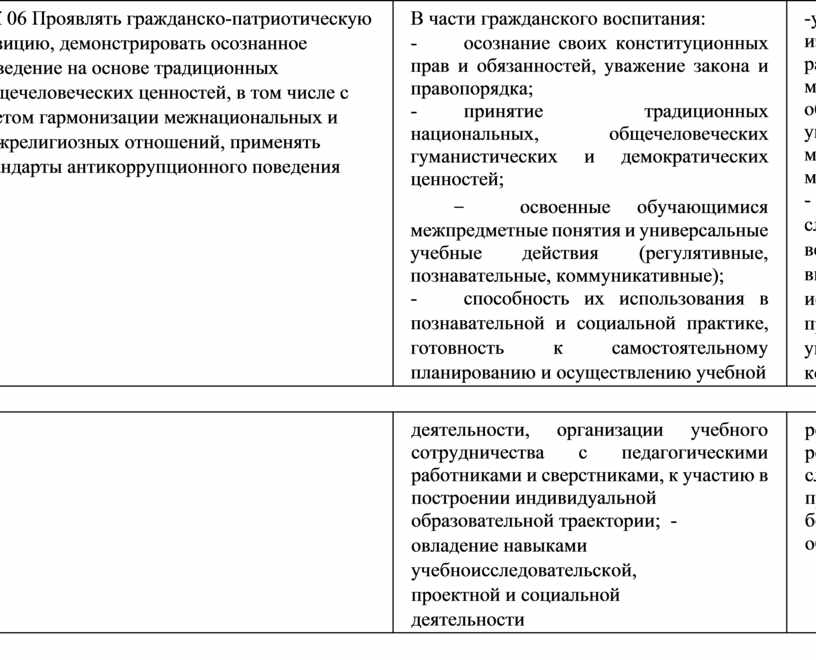 ОК 06. Проявлять гражданскопатриотическую позицию, демонстрировать осознанное поведение на основе традиционных общечеловеческих ценностей, в том числе с учетом гармонизации межнациональных и межрелигиозных отношений, применять стандарты антикоррупционного поведения |
