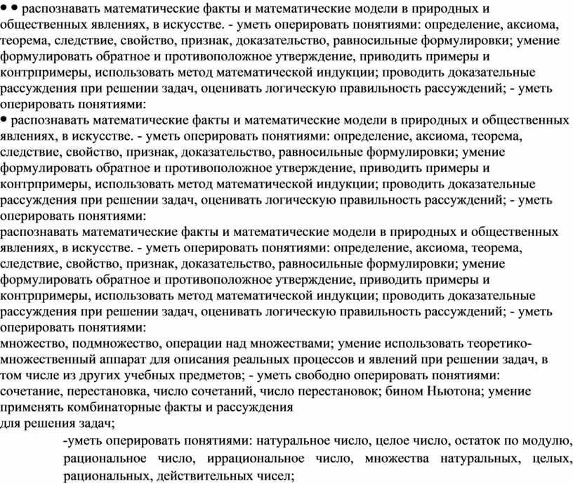распознавать математические факты и математические модели в природных и общественных явлениях, в искусстве. - уметь оперировать понятиями: определение, аксиома, теорема, следствие, свойство, признак, доказательство, равносильные формулировки; умение формулировать обратное и противоположное утверждение, приводить примеры и контрпримеры, использовать метод математической индукции; проводить доказательные рассуждения при решении задач, оценивать логическую правильность рассуждений; - уметь оперировать понятиями: множество, подмножество, операции над множествами; умение использовать теоретико-множественный аппарат для описания реальных процессов и явлений при решении задач, в том числе из других учебных предметов; - уметь свободно оперировать понятиями: сочетание, перестановка, число сочетаний, число перестановок; бином Ньютона; умение применять комбинаторные факты и рассуждения для решения задач; -уметь оперировать понятиями: натуральное число, целое число, остаток по модулю, рациональное число, иррациональное число, множества натуральных, целых, рациональных, действительных чисел; умение использовать признаки делимости, наименьший общий |