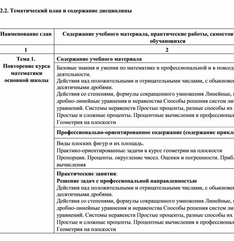 Базовые знания и умения по математике в профессиональной и в повседневной деятельности. Действия над положительными и отрицательными числами, с обыкновенными и десятичными дробями. Действия со степенями, формулы сокращенного умножения Линейные, квадратные, дробно-линейные уравнения и неравенства Способы решения систем линейных уравнений. Системы неравенств Простые проценты, разные способы их вычисления. Простые и сложные проценты. Процентные вычисления в профессиональных задачах Геометрия на плоскости |