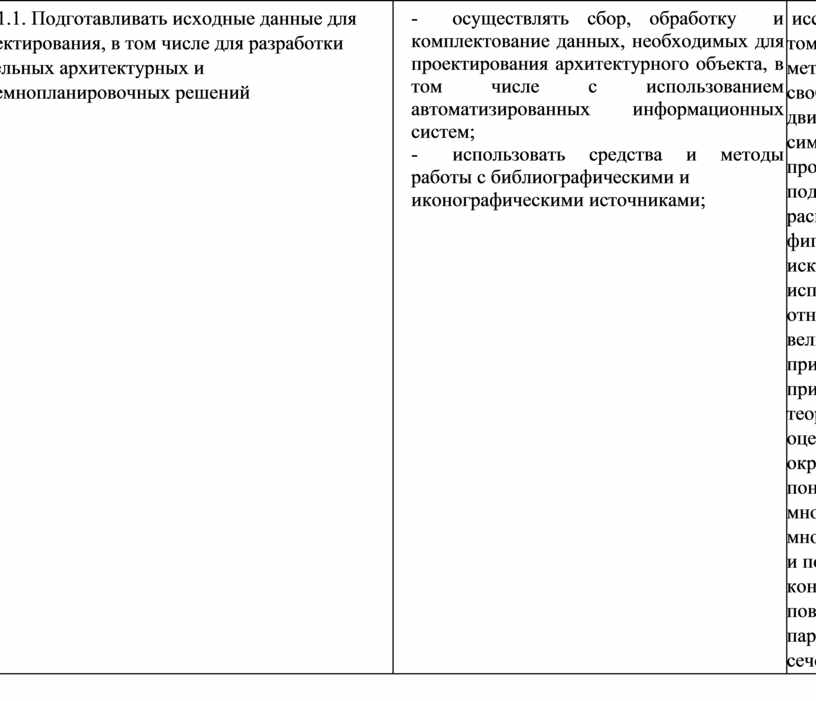 ПК 1.1. Подготавливать исходные данные для проектирования, в том числе для разработки отдельных архитектурных и объемнопланировочных решений |