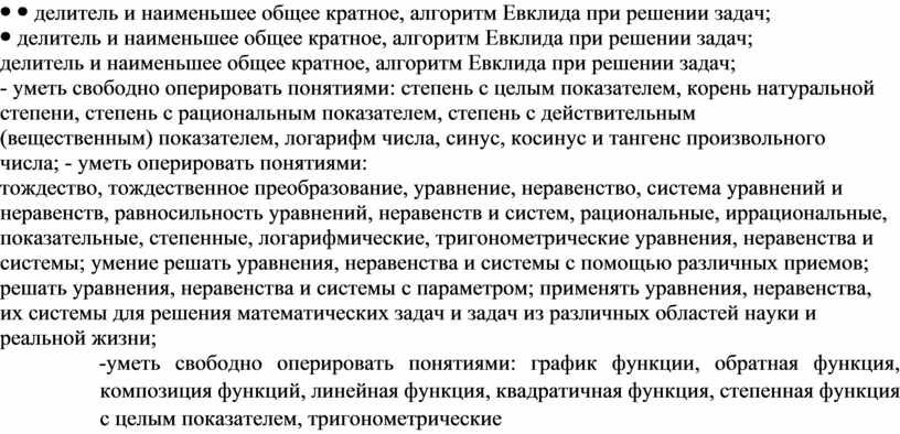делитель и наименьшее общее кратное, алгоритм Евклида при решении задач; - уметь свободно оперировать понятиями: степень с целым показателем, корень натуральной степени, степень с рациональным показателем, степень с действительным (вещественным) показателем, логарифм числа, синус, косинус и тангенс произвольного числа; - уметь оперировать понятиями: тождество, тождественное преобразование, уравнение, неравенство, система уравнений и неравенств, равносильность уравнений, неравенств и систем, рациональные, иррациональные, показательные, степенные, логарифмические, тригонометрические уравнения, неравенства и системы; умение решать уравнения, неравенства и системы с помощью различных приемов; решать уравнения, неравенства и системы с параметром; применять уравнения, неравенства, их системы для решения математических задач и задач из различных областей науки и реальной жизни; -уметь свободно оперировать понятиями: график функции, обратная функция, композиция функций, линейная функция, квадратичная функция, степенная функция с целым показателем, тригонометрические функции, обратные тригонометрические функции, |