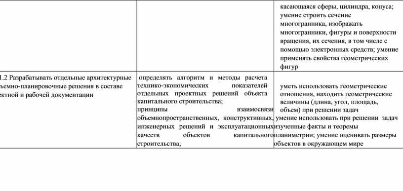 касающаяся сферы, цилиндра, конуса; умение строить сечение многогранника, изображать многогранники, фигуры и поверхности вращения, их сечения, в том числе с помощью электронных средств; умение применять свойства геометрических фигур |