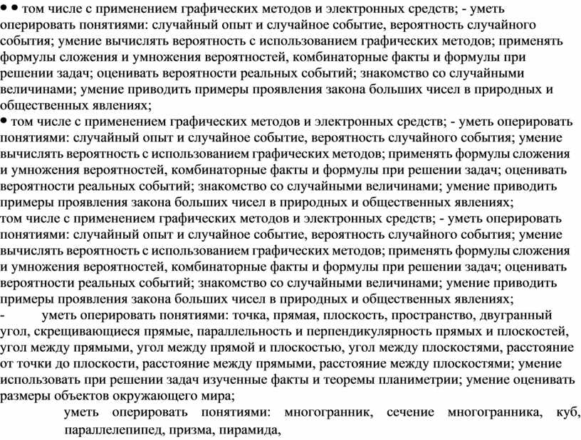 том числе с применением графических методов и электронных средств; - уметь оперировать понятиями: случайный опыт и случайное событие, вероятность случайного события; умение вычислять вероятность с использованием графических методов; применять формулы сложения и умножения вероятностей, комбинаторные факты и формулы при решении задач; оценивать вероятности реальных событий; знакомство со случайными величинами; умение приводить примеры проявления закона больших чисел в природных и общественных явлениях; - уметь оперировать понятиями: точка, прямая, плоскость, пространство, двугранный угол, скрещивающиеся прямые, параллельность и перпендикулярность прямых и плоскостей, угол между прямыми, угол между прямой и плоскостью, угол между плоскостями, расстояние от точки до плоскости, расстояние между прямыми, расстояние между плоскостями; умение использовать при решении задач изученные факты и теоремы планиметрии; умение оценивать размеры объектов окружающего мира; - уметь оперировать понятиями: многогранник, сечение многогранника, куб, параллелепипед, призма, пирамида, фигура и поверхность вращения, цилиндр, конус, шар, сфера, |