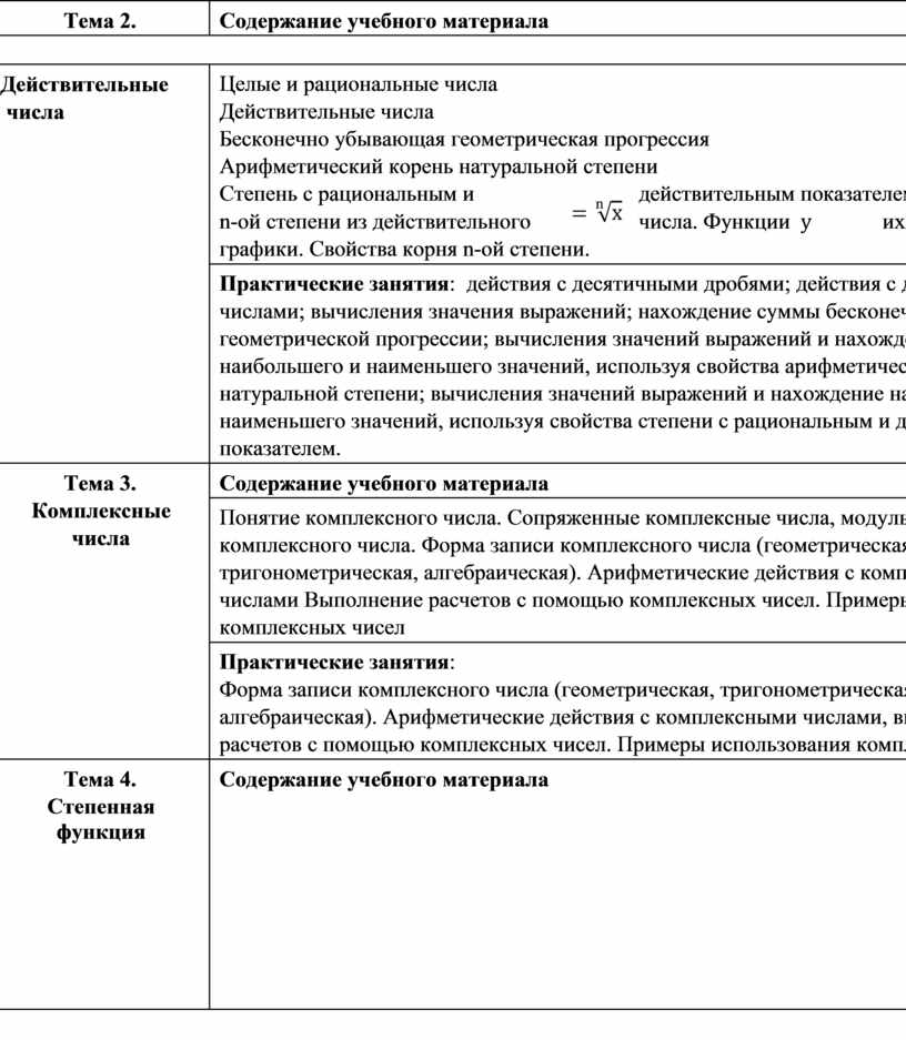 Тема 1. Повторение курса математики основной школы Тема 2. Действительные числа Тема 3. Комплексные числа |