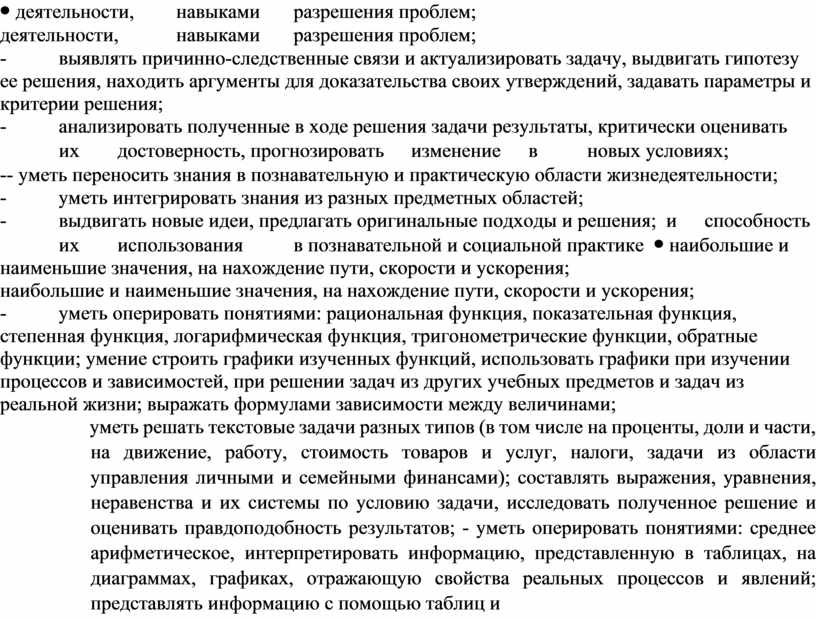 наибольшие и наименьшие значения, на нахождение пути, скорости и ускорения; - уметь оперировать понятиями: рациональная функция, показательная функция, степенная функция, логарифмическая функция, тригонометрические функции, обратные функции; умение строить графики изученных функций, использовать графики при изучении процессов и зависимостей, при решении задач из других учебных предметов и задач из реальной жизни; выражать формулами зависимости между величинами; - уметь решать текстовые задачи разных типов (в том числе на проценты, доли и части, на движение, работу, стоимость товаров и услуг, налоги, задачи из области управления личными и семейными финансами); составлять выражения, уравнения, неравенства и их системы по условию задачи, исследовать полученное решение и оценивать правдоподобность результатов; - уметь оперировать понятиями: среднее арифметическое, интерпретировать информацию, представленную в таблицах, на диаграммах, графиках, отражающую свойства реальных процессов и явлений; представлять информацию с помощью таблиц и диаграмм; исследовать статистические данные, в |