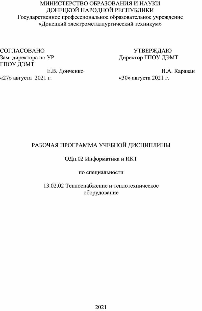 Рабочая программа учебной дисциплины ОДп.02 Информатика и ИКТ является частью программы подготовки квалифицированных рабочих, служащих в соответствии с ГОС СПО по специальности 13.02.02 Теплоснабжение и теплотехническое оборудование.