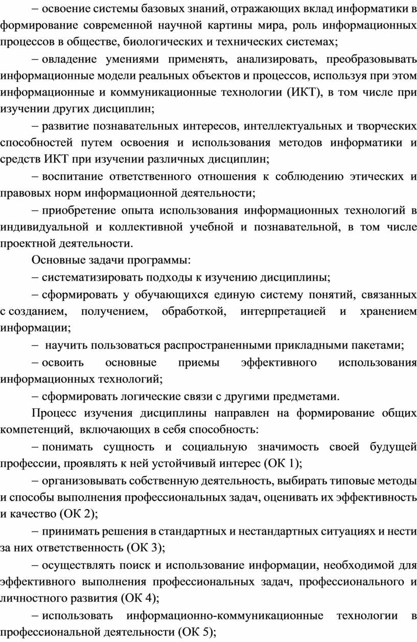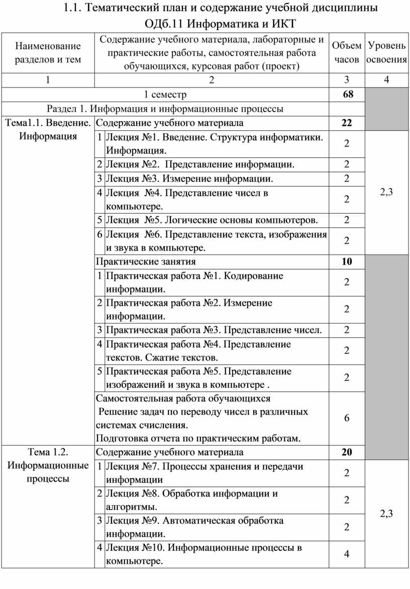 Дисциплина ОДбп.02 Информатика и ИКТ на первом курсе рассчитана на продолжение изучения информатики и ИКТ после освоения основ предмета в классах основной школы. Систематизирующей основой содержания предмета ОДп.02 Информатика и ИКТ, изучаемого на разных ступенях образования, является единая содержательная структура предметной области, которая включает в себя следующие разделы: