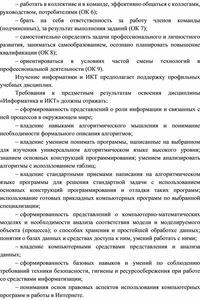 Изучение дисциплины ОДп.02 Информатика и ИКТ предполагает поддержку профильных учебных дисциплин.