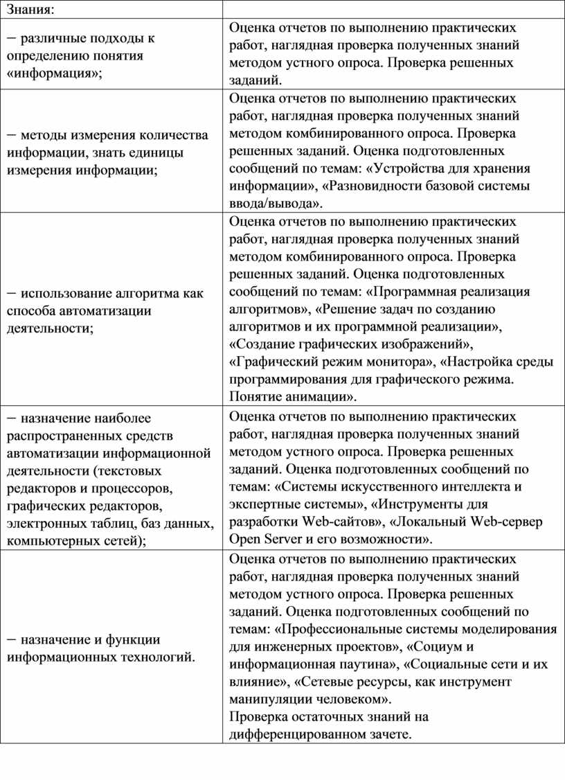 Оценка отчетов по выполнению практических работ, наглядная проверка полученных знаний методом устного опроса. Проверка решенных заданий. Оценка подготовленных сообщений по темам: «Профессиональные системы моделирования для инженерных проектов», «Социум и информационная паутина», «Социальные сети и их влияние», «Сетевые ресурсы, как инструмент манипуляции человеком». Проверка остаточных знаний на дифференцированном зачете. |