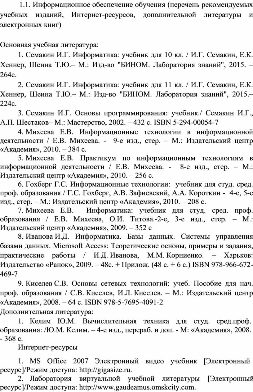 2. Семакин И.Г. Информатика: учебник для 11 кл. / И.Г. Семакин, Е.К. Хеннер, Шеина Т.Ю.– М.: Изд-во "БИНОМ. Лаборатория знаний", 2015.– 224с.