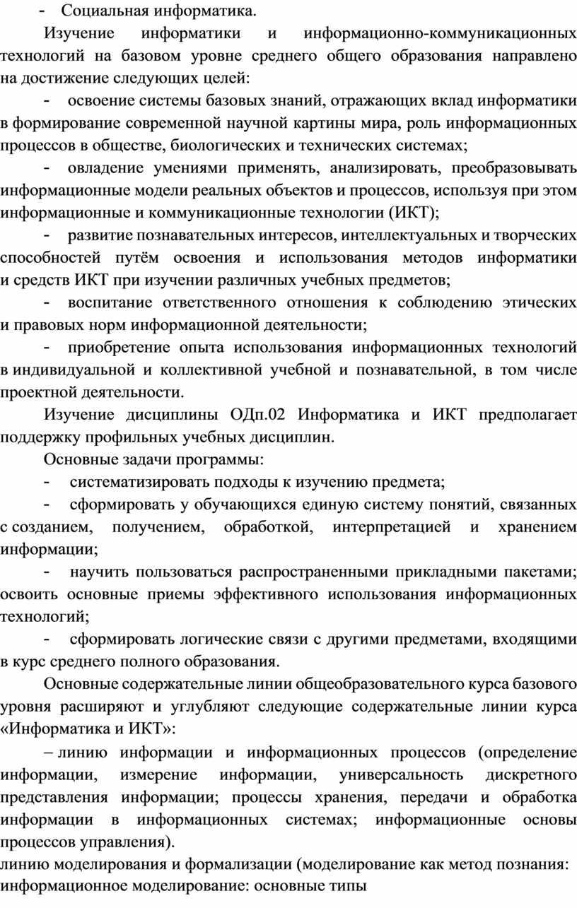 Информатика и ИКТ – учебный предмет, востребованный во всех видах профессиональной деятельности и различных траекториях продолжения обучения. Приоритетными направлениями изучения в дисциплине ОДп.02 Информатика и ИКТ на базовом уровне выступают информационные процессы и информационные технологии.