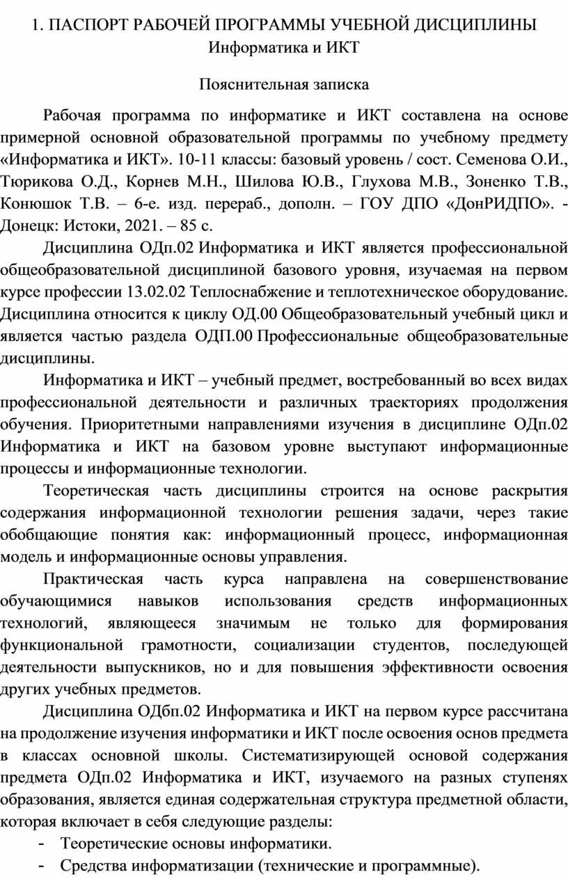Рабочая программа по информатике и ИКТ составлена на основе примерной основной образовательной программы по учебному предмету «Информатика и ИКТ». 10-11 классы: базовый уровень / сост. Семенова О.И., Тюрикова О.Д., Корнев М.Н., Шилова Ю.В., Глухова М.В., Зоненко Т.В., Конюшок Т.В. – 6-е. изд. перераб., дополн. – ГОУ ДПО «ДонРИДПО». - Донецк: Истоки, 2021. – 85 с.