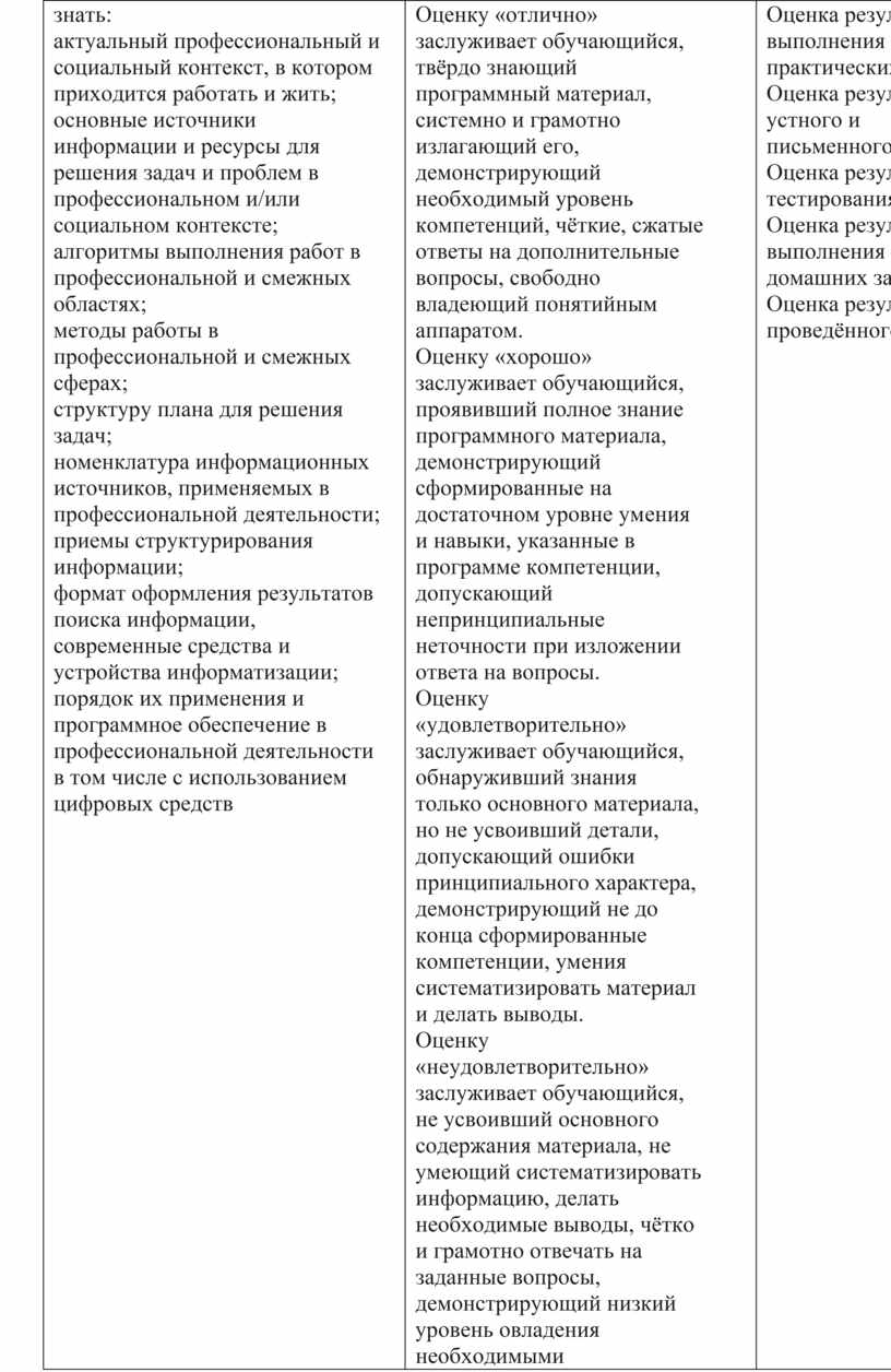 знать: актуальный профессиональный и социальный контекст, в котором приходится работать и жить; основные источники информации и ресурсы для решения задач и проблем в профессиональном и/или социальном контексте; алгоритмы выполнения работ в профессиональной и смежных областях; методы работы в профессиональной и смежных сферах; структуру плана для решения задач; номенклатура информационных источников, применяемых в профессиональной деятельности; приемы структурирования информации; формат оформления результатов поиска информации, современные средства и устройства информатизации; порядок их применения и программное обеспечение в профессиональной деятельности в том числе с использованием цифровых средств