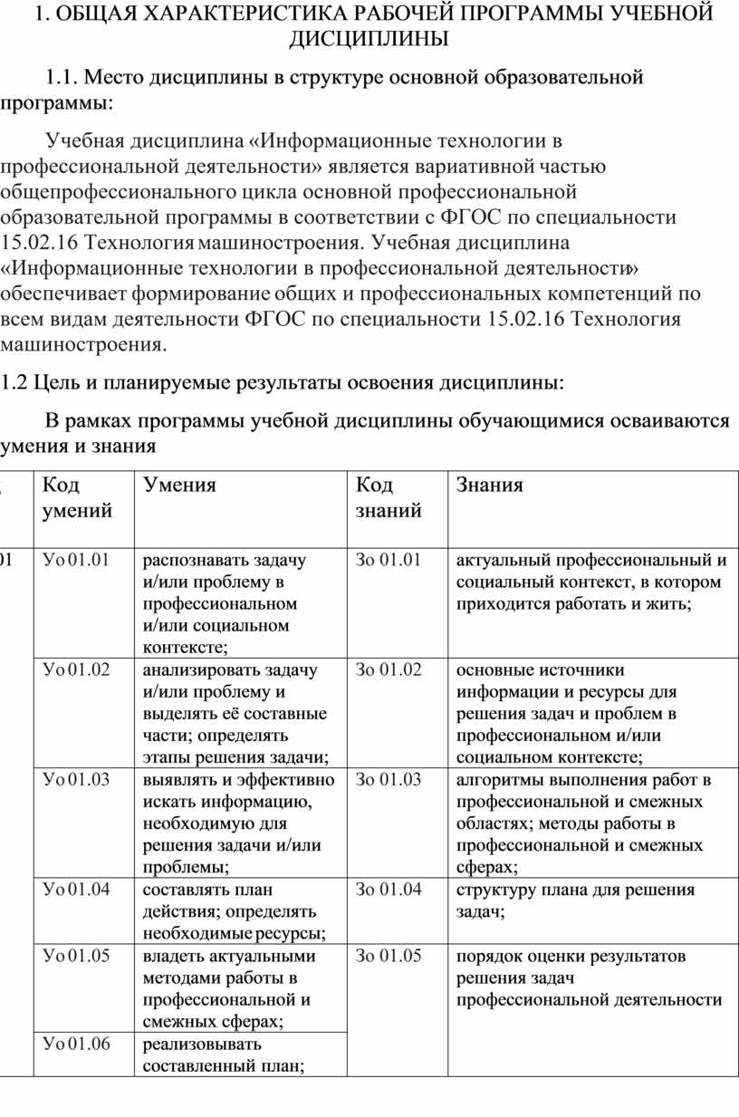 Рабочая программа учебной дисциплины ОП 010 ИНФОРМАЦИОННЫЕ ТЕХНОЛОГИИ В ПРОФЕССИОНАЛЬНОЙ ДЕЯТЕЛЬНОСТИ разработана в соответствии с ФГОС по специальности среднего профессионального образования 15.02.16 Технология машиностроения (утв. Приказом Минпросвещения России от 14.06.2022г. №444), в соответствии с Учебным планом, утв. «30» августа 2024г.