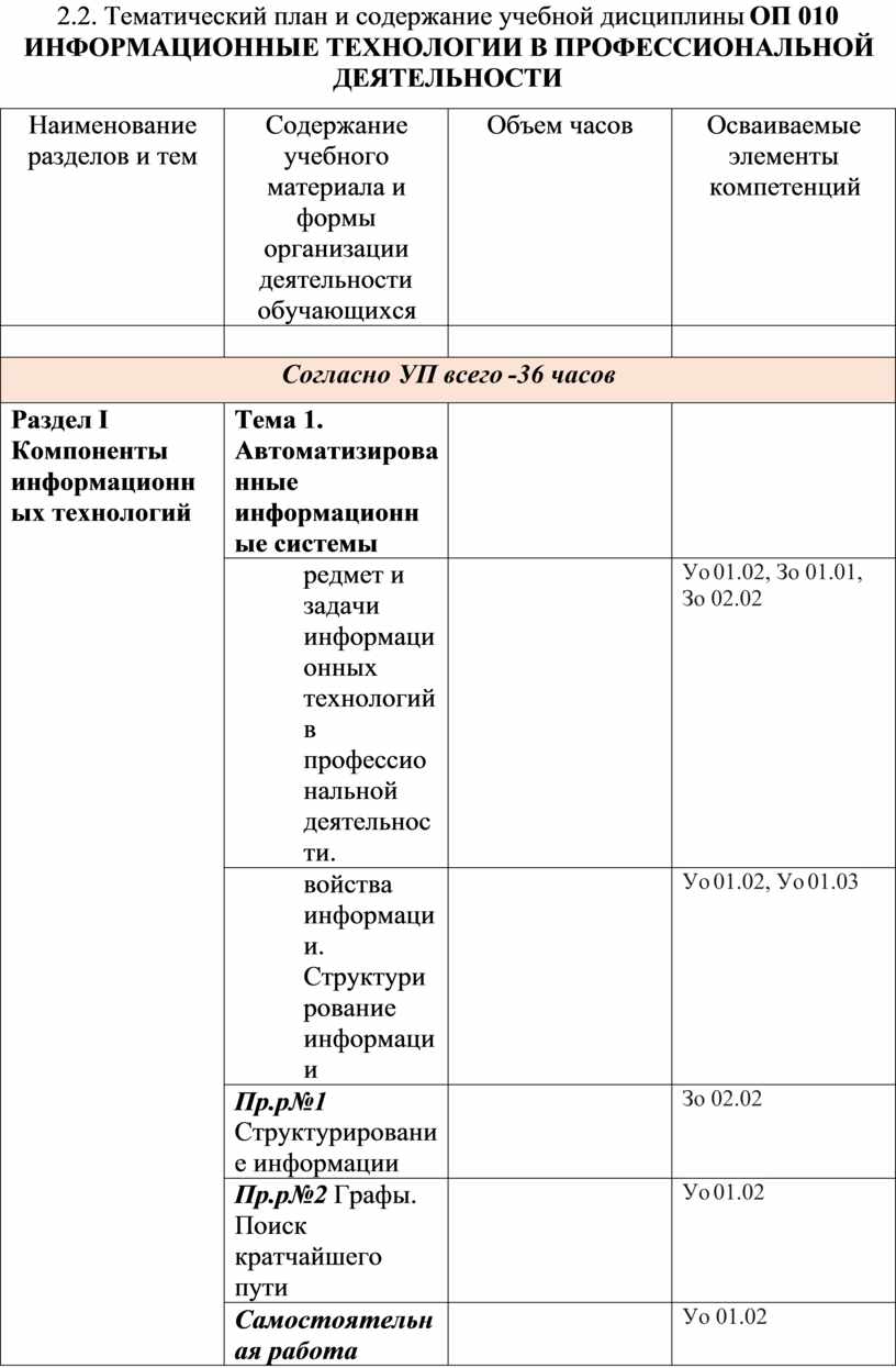 2.2. Тематический план и содержание учебной дисциплины ОП 010 ИНФОРМАЦИОННЫЕ ТЕХНОЛОГИИ В ПРОФЕССИОНАЛЬНОЙ ДЕЯТЕЛЬНОСТИ