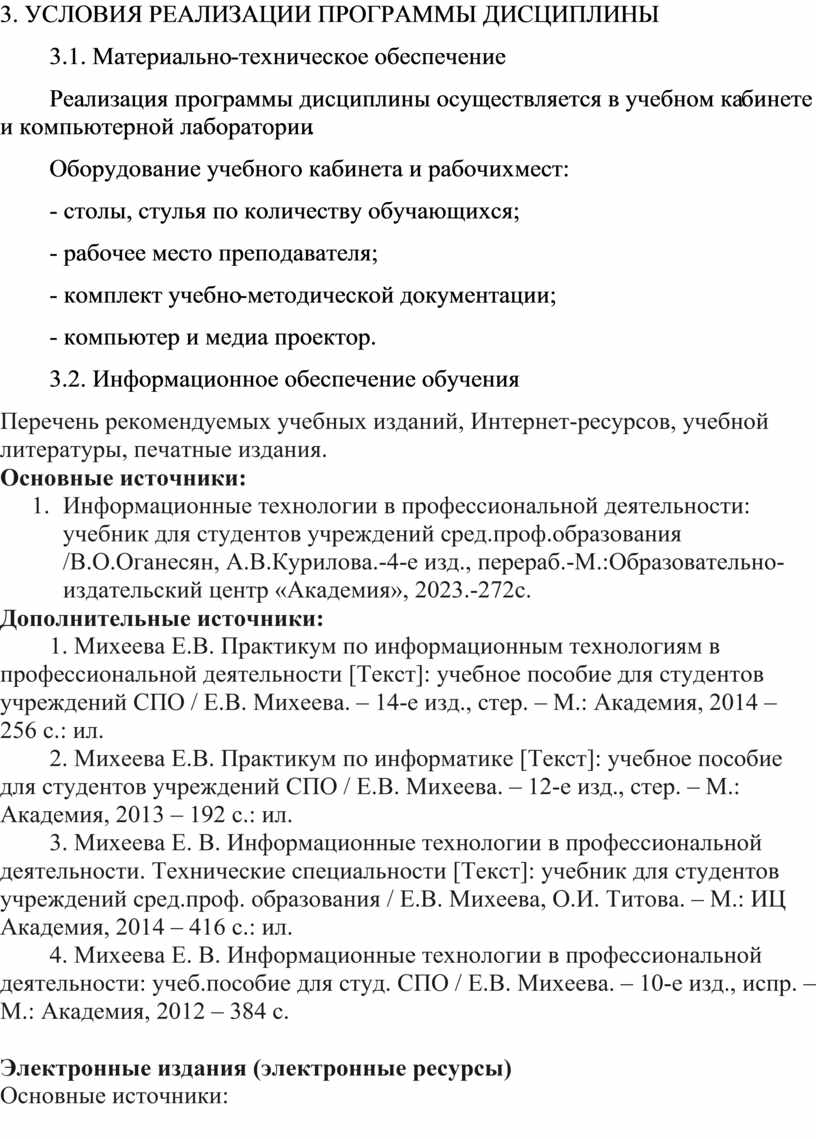 1. Информационные технологии в профессиональной деятельности: учебник для студентов учреждений сред.проф.образования /В.О.Оганесян, А.В.Курилова.-4-е изд., перераб.-М.:Образовательно-издательский центр «Академия», 2023.-272с.