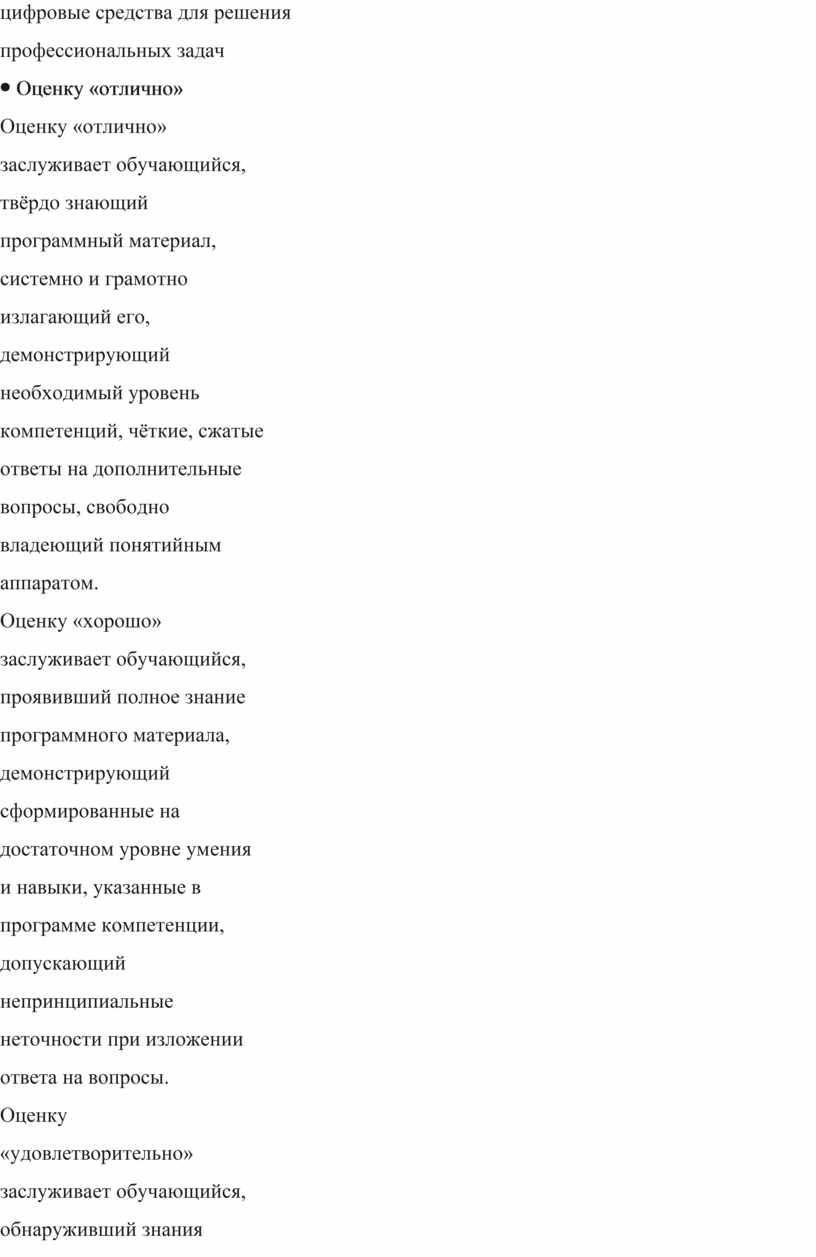 Оценку «отлично» заслуживает обучающийся, твёрдо знающий программный материал, системно и грамотно излагающий его, демонстрирующий необходимый уровень компетенций, чёткие, сжатые ответы на дополнительные вопросы, свободно владеющий понятийным аппаратом. Оценку «хорошо» заслуживает обучающийся, проявивший полное знание программного материала, демонстрирующий сформированные на достаточном уровне умения и навыки, указанные в программе компетенции, допускающий непринципиальные неточности при изложении ответа на вопросы. Оценку «удовлетворительно» заслуживает обучающийся, обнаруживший знания только основного материала, но не усвоивший детали, допускающий ошибки принципиального характера, демонстрирующий не до конца сформированные компетенции, умения систематизировать материал и делать выводы. Оценку «неудовлетворительно» заслуживает обучающийся, не усвоивший основного содержания материала, не умеющий систематизировать информацию, делать необходимые выводы, чётко и грамотно отвечать на заданные вопросы, демонстрирующий низкий уровень овладения необходимыми компетенциями. |