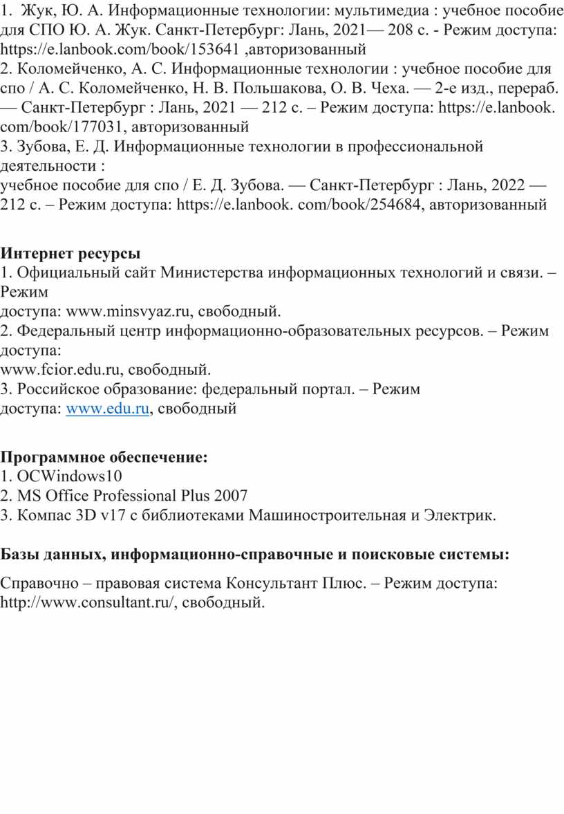 2. Коломейченко, А. С. Информационные технологии : учебное пособие для спо / А. С. Коломейченко, Н. В. Польшакова, О. В. Чеха. — 2-е изд., перераб. — Санкт-Петербург : Лань, 2021 — 212 с. – Режим доступа: https://e.lanbook. com/book/177031, авторизованный