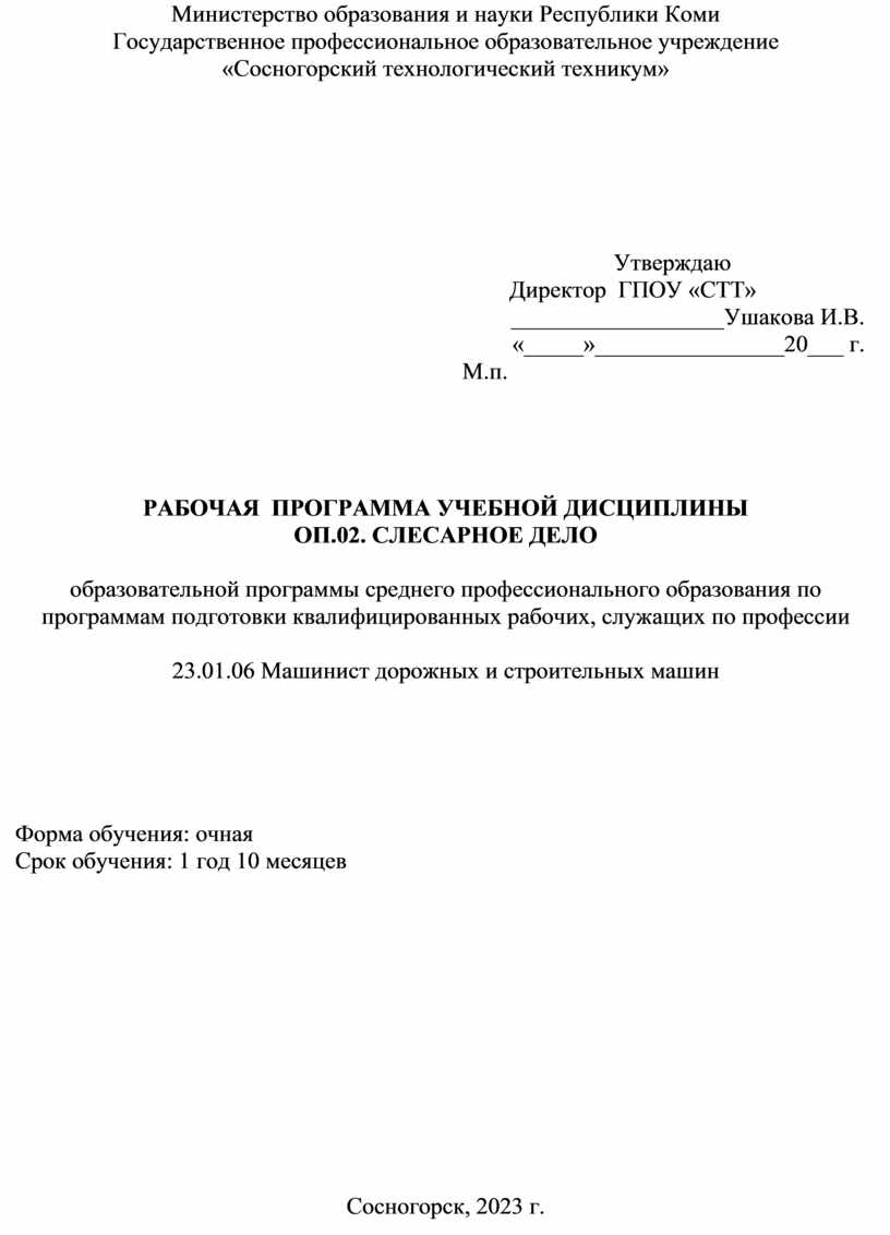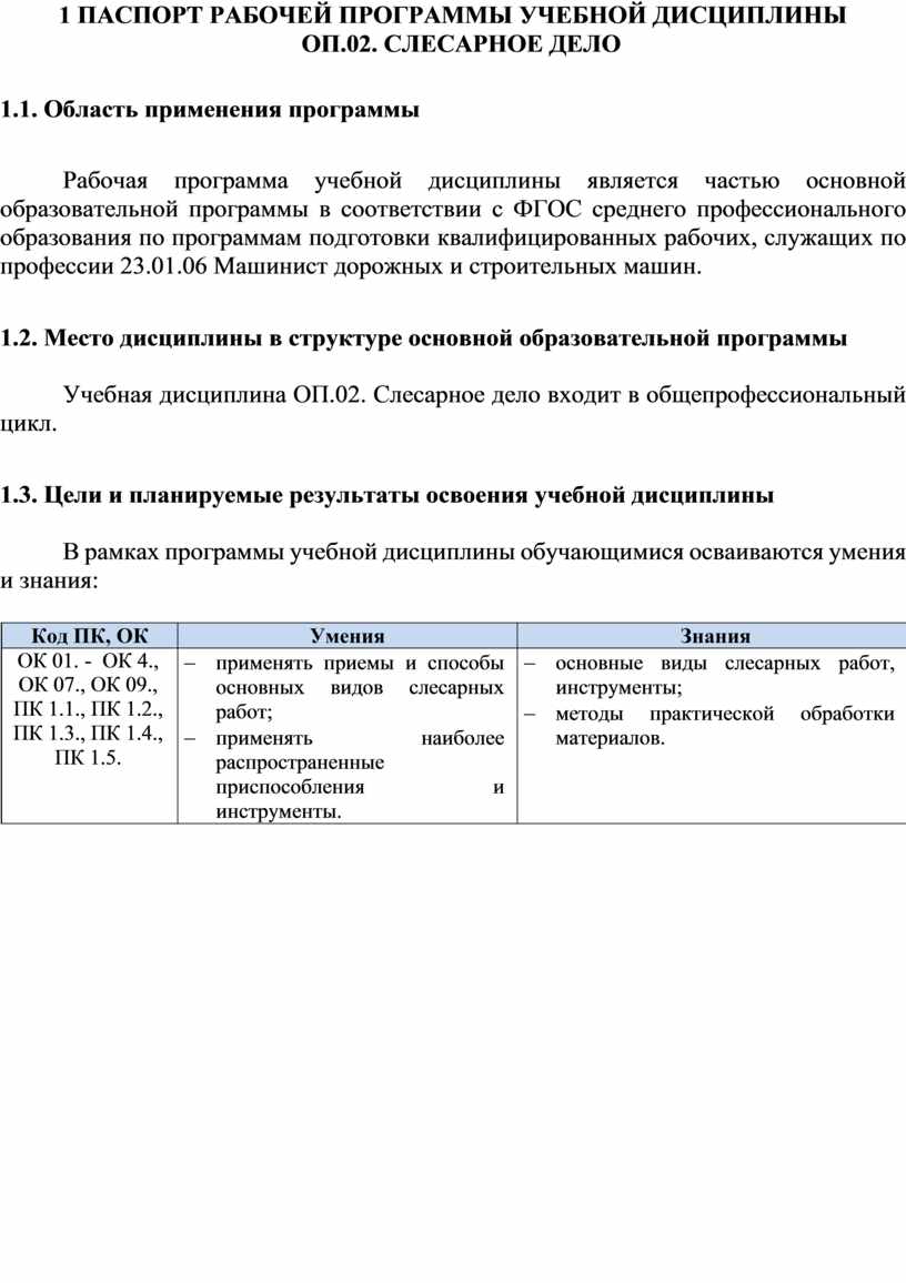 Рабочая программа учебной дисциплины ОП.02. Слесарное дело разработана на основе требований: