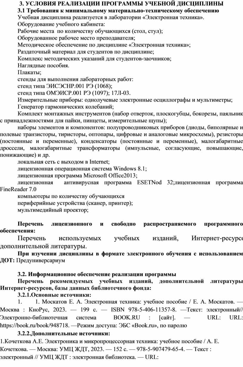 1. 1. Москатов Е. А. Электронная техника: учебное пособие / Е. А. Москатов. — Москва : КноРус, 2023. — 199 с. — ISBN 978-5-406-11357-8. —Текст: электронный// Электронно-библиотечная система BOOK.RU : [сайт]. — URL: URL: https://book.ru/book/948718. —Режим доступа: ЭБС «Book.ru», по паролю