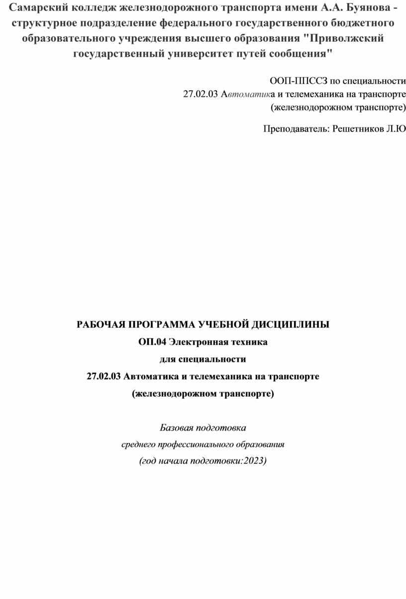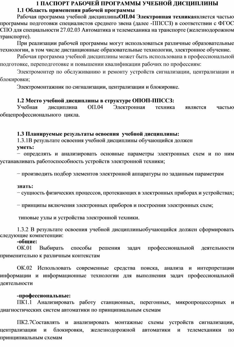 Рабочая программа учебной дисциплиныОП.04 Электронная техникаявляется частью программы подготовки специалистов среднего звена (далее -ППССЗ) в соответствии с ФГОС СПО для специальности 27.02.03 Автоматика и телемеханика на транспорте (железнодорожном транспорте).