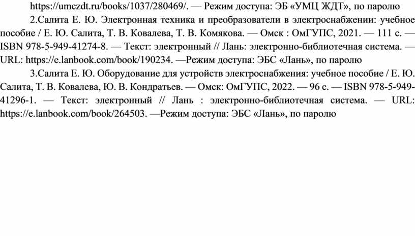 3.Салита Е. Ю. Оборудование для устройств электроснабжения: учебное пособие / Е. Ю. Салита, Т. В. Ковалева, Ю. В. Кондратьев. — Омск: ОмГУПС, 2022. — 96 с. — ISBN 978-5-949-41296-1. — Текст: электронный // Лань : электронно-библиотечная система. — URL: https://e.lanbook.com/book/264503. —Режим доступа: ЭБС «Лань», по паролю