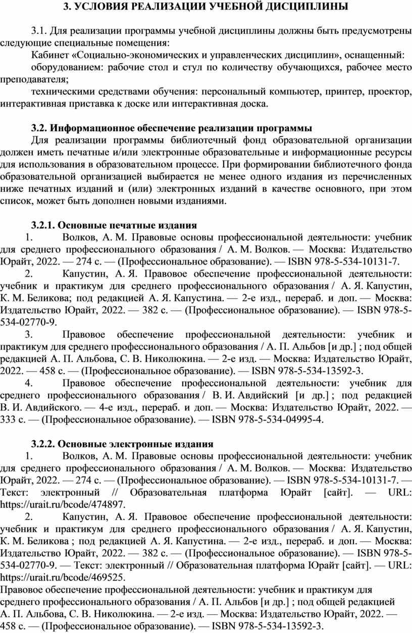 1. Волков, А. М. Правовые основы профессиональной деятельности: учебник для среднего профессионального образования / А. М. Волков. — Москва: Издательство Юрайт, 2022. — 274 с. — (Профессиональное образование). — ISBN 978-5-534-10131-7.