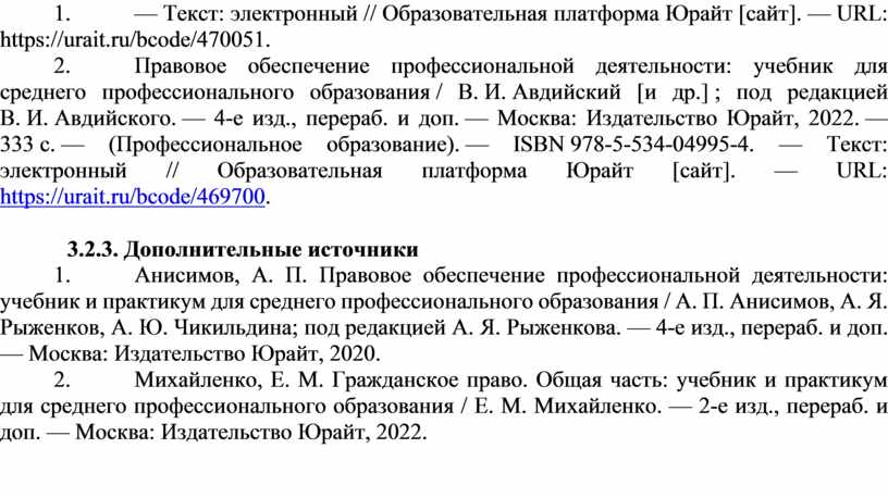 2. Капустин, А. Я. Правовое обеспечение профессиональной деятельности: учебник и практикум для среднего профессионального образования / А. Я. Капустин, К. М. Беликова; под редакцией А. Я. Капустина. — 2-е изд., перераб. и доп. — Москва: Издательство Юрайт, 2022. — 382 с. — (Профессиональное образование). — ISBN 978-5-534-02770-9.