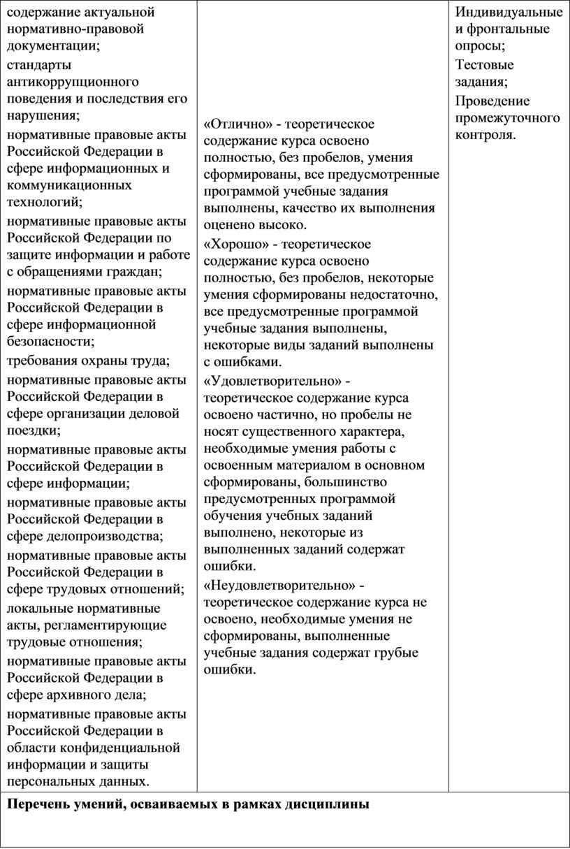 содержание актуальной нормативно-правовой документации; стандарты антикоррупционного поведения и последствия его нарушения; нормативные правовые акты Российской нормативные правовые акты Российской нормативные правовые акты Российской требования охраны труда; нормативные правовые акты Российской нормативные правовые акты Российской нормативные правовые акты Российской нормативные правовые акты Российской Федерации в сфере трудовых отношений; локальные нормативные акты, регламентирующие трудовые отношения; нормативные правовые акты Российской Федерации в сфере архивного дела; нормативные правовые акты Российской |