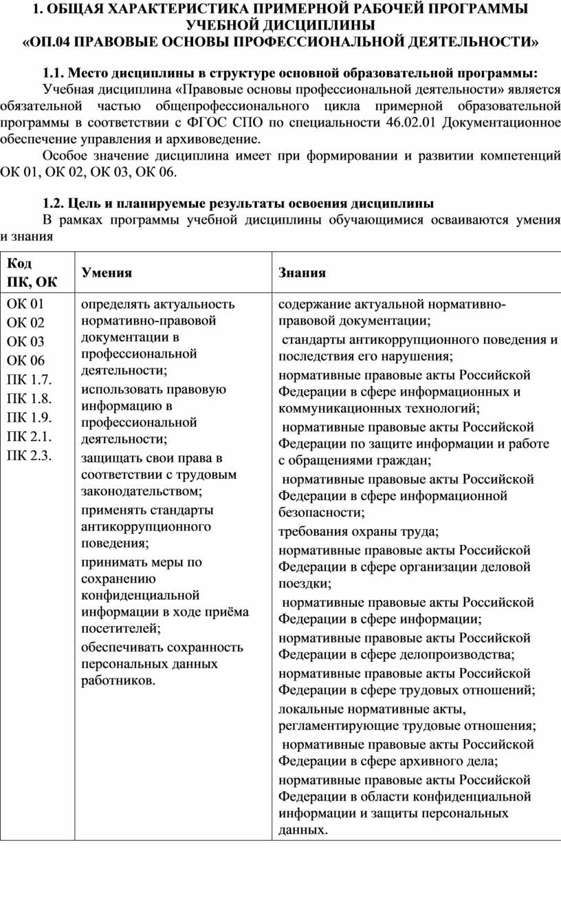 Учебная дисциплина «Правовые основы профессиональной деятельности» является обязательной частью общепрофессионального цикла примерной образовательной программы в соответствии с ФГОС СПО по специальности 46.02.01 Документационное обеспечение управления и архивоведение.