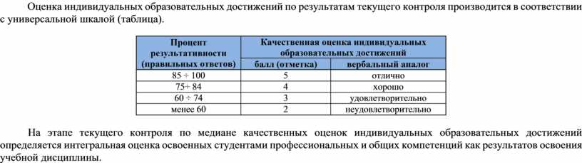 Оценка индивидуальных образовательных достижений по результатам текущего контроля производится в соответствии с универсальной шкалой (таблица).