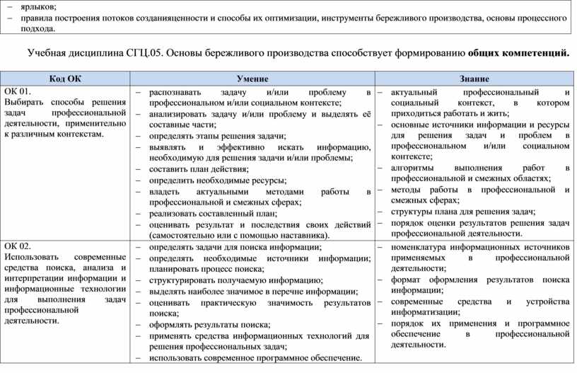 Учебная дисциплина СГЦ.05. Основы бережливого производства способствует формированию общих компетенций.