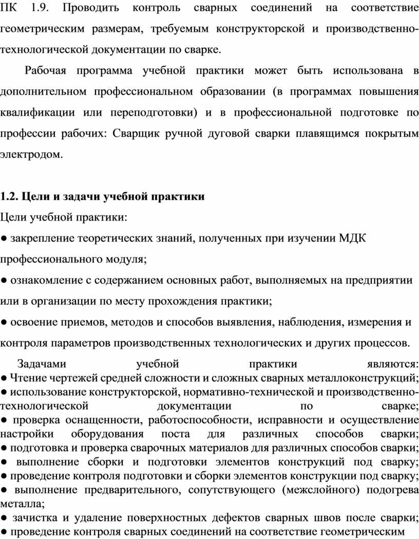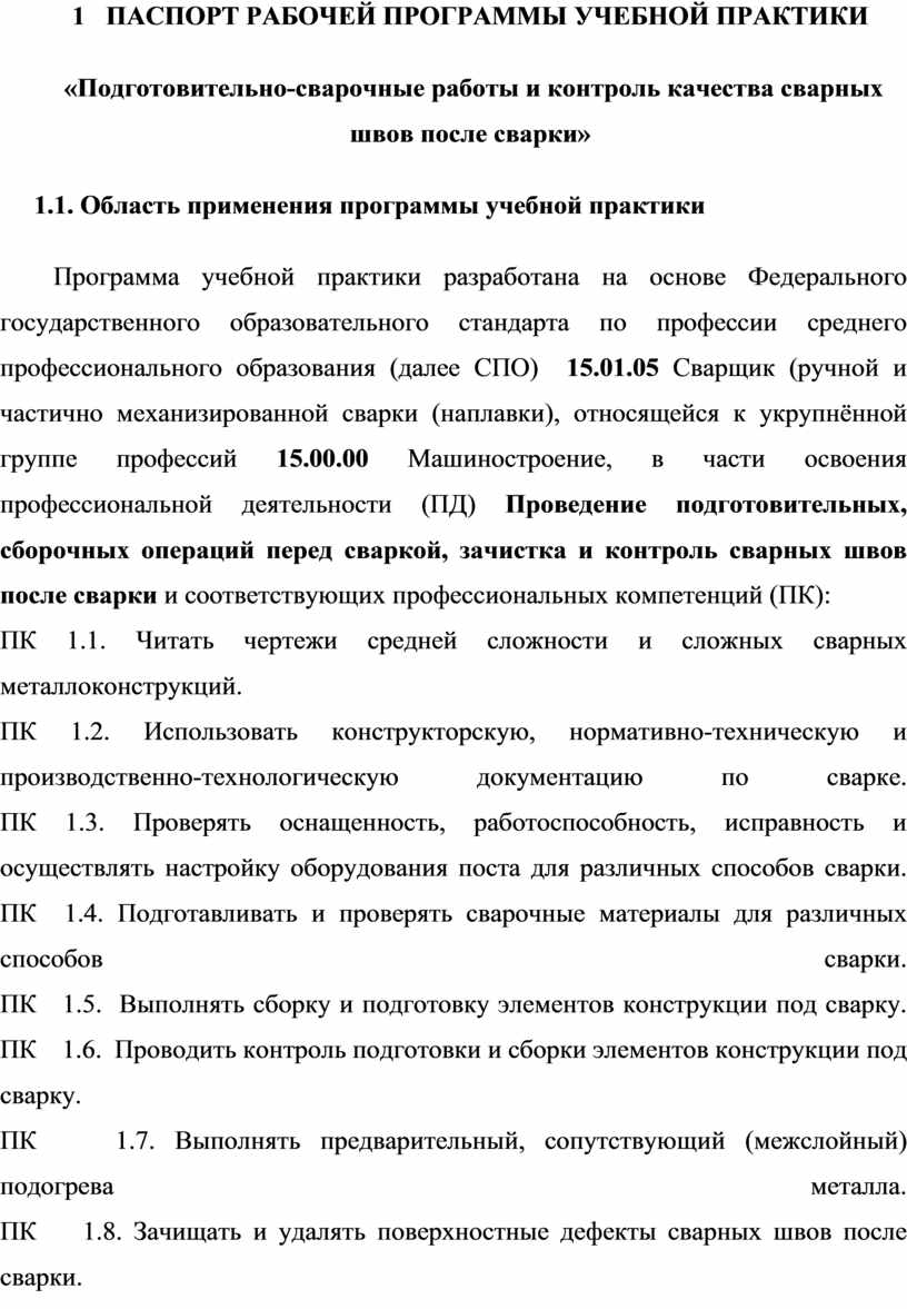 Программа учебной практики разработана на основе Федерального государственного образовательного стандарта по профессии среднего профессионального образования (далее СПО) 15.01.05 Сварщик (ручной и частично механизированной сварки (наплавки), относящейся к укрупнённой группе профессий 15.00.00 Машиностроение, в части освоения профессиональной деятельности (ПД) Проведение подготовительных, сборочных операций перед сваркой, зачистка и контроль сварных швов после сварки и соответствующих профессиональных компетенций (ПК):
